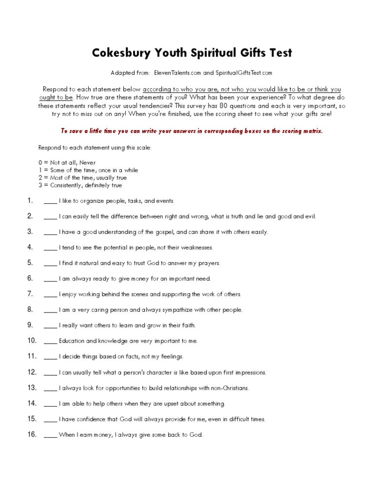Some items reflect concrete actions; Web generating a printable spiritual gifts test. Spiritual gifts 39.i'm very sensitive to sad stories. Depending on how you feel about each statement, enter a number between 1 and 10 where 1 means that the statement does not describe you at all and 10 means that the statement describes you.